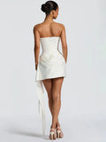 Vestido curto, sem alças e com ombros de fora da elegante, sem mangas, com decote nas costas